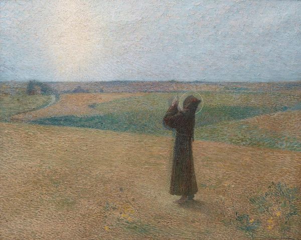 Editor: This is Ivan Grohar’s "The Sower," painted in 1907. It’s an oil painting with quite a rough, textured surface. I find it rather melancholic. What's your take? Curator: It’s a powerful image precisely because it’s steeped in its historical and social context. Beyond its surface, this painting is deeply intertwined with questions of labor, class, and national identity in early 20th-century Slovenia, then part of the Austro-Hungarian Empire. Editor: How so? I just see a farmer doing his job. Curator: Think about the romanticized view of rural life often presented, particularly by those in power. Grohar's 'Sower', with his back turned, toiling, prompts us to consider the uncelebrated labor that sustains society. The figure is anonymous, everyman. Grohar gives visibility to a social class often rendered invisible, wouldn’t you say? Editor: I see your point about the "invisible" labor. It is a Post-Impressionist painting, but also somewhat realistic in its representation of that hard labor. Curator: Yes, and it also reminds me to reflect on the social commentary of Millet's and Van Gogh's peasants. But instead of clear political references, we see an anonymous figure against the Slovenian landscape and its connection to the land. What does that suggest to you? Editor: A sense of belonging maybe? That's thought-provoking. I now realize there's more to this image than initially met the eye. Curator: Exactly. It's an invitation to ponder on broader themes of work, class consciousness, and the symbolic weight of connecting the past to our present-day discussions.
