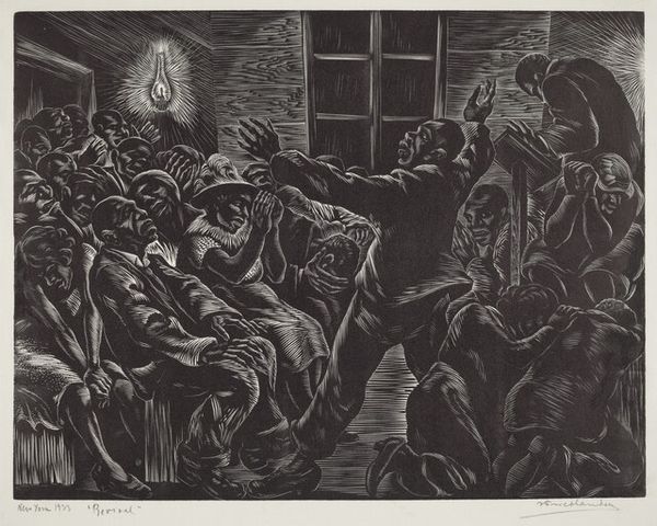 Isac Friedlander made this print, Intercepted, in 1941, and what strikes me is the raw, graphic quality of the woodcut, the way he’s wrestled with the block to get these stark contrasts. It's like the image is fighting its way out of the darkness. The texture feels almost… visceral. You can practically feel the artist digging into the wood, each gouge and scrape carving out these figures, these desperate faces. Look at the way the light catches on the faces, how the dark lines seem to trap the figures in a moment of intense emotion. The physical act of cutting seems so connected to the emotional weight of the subject matter. The print reminds me of the German Expressionists, like Kathe Kollwitz, who also used printmaking to express themes of social justice. There’s a sense of urgency here, a cry for help etched in black and white, and in the end, maybe that's what art is, a way of speaking when words fail.