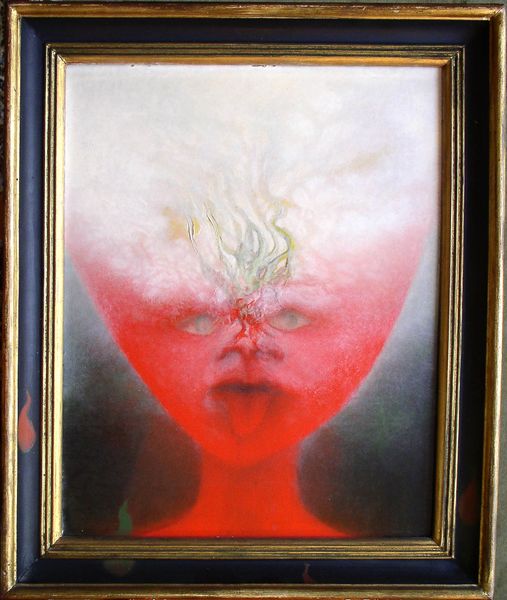 Curator: Here we have an untitled work by Zdzislaw Beksinski, likely created with oil paint. Beksinski’s oeuvre often touches on Gothic and Surrealist sensibilities, creating disquieting yet compelling imagery. Editor: It’s…unsettling. Those eyes, glowing like embers, pierce right through you. And the texture – is it flesh? Decay? It’s fascinatingly grotesque, whatever it is. Curator: That tension, that visceral reaction, is precisely what situates Beksinski within a lineage of artists grappling with the darker aspects of the human condition. Think Goya, or perhaps some of the more macabre Symbolists. His art emerged in a Poland still under the shadow of Soviet control; you can feel that weight, that sense of suppressed anxiety, permeating the work. Editor: I’m drawn to how Beksinski uses oil paint here. It isn't about smooth illusionism, is it? It’s like he's building up layers, almost sculpting the surface. It emphasizes the materiality, the physical presence of this… thing. The means of production underscore the horror it provokes, don't you think? Curator: Absolutely. The very act of creation becomes a reflection of the disturbing subject matter. He rejected most interpretations of his art, insisting it was simply what it was, yet clearly he was engaging with collective fears, societal traumas. He tapped into something primal, and, in turn, the audience found him and his art in spite of censors. Editor: This use of 'matter-painting' makes me think about how it relates to art as labor. Beksinski’s dedicated manual process stands apart from mass production; it becomes something rare and highly valued precisely because it carries his dedication of labor into these uncomfortable emotional spaces. The social currency derives from confronting rather than averting this horror, which is an unusual inversion. Curator: Indeed. It stands as a testament to art's ability to not just reflect but also process our collective anxieties and to achieve recognition beyond institutional constraints. Editor: Ultimately, whether a study in political constraint, decay or materiality, it forces us to confront uncomfortable realities about existence, itself. Curator: An apt observation, prompting us to look further than just aesthetic or artistic traditions.