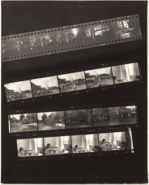Editor: This is Robert Frank's "Guggenheim 398--Las Vegas, Nevada," taken in 1955, a contact sheet made from film. I find it interesting that this isn't the finished work, but the artist’s process itself that we are examining. What strikes you about it? Curator: The formal arrangement immediately asserts itself. The grid structure, dictated by the contact sheet, creates a serial effect, a rhythmic progression across the frame. Notice how Frank utilizes the inherent properties of the film strip—the sprockets, the frame edges—to contribute to the overall composition. Editor: It's almost like he's not just showing us images, but the *making* of the images. How does that contribute to the meaning? Curator: Precisely. The high contrast in each frame—the stark blacks and whites—emphasizes the photographic process. Each tiny window, when considered together, challenges traditional photographic representation. Observe the use of light. In many frames, there’s an over-exposure creating a kind of flattening. Is Frank manipulating that light and dark contrast to speak about society? Editor: The cityscapes and what appears to be some signage… so he isn’t going for balanced exposure but really creating an uneven emotional tonality. The sprockets feel important too - their repeated shapes highlight this idea. Curator: Indeed. He is drawing our attention not just to *what* is represented, but to the mechanics of representation itself, and perhaps questioning traditional, romantic visions of the American landscape. The materiality of the film strip itself *is* the message here. Editor: I never considered the process as the piece itself. Seeing the individual frames this way shifts my entire perception. Curator: Yes, it moves us beyond subject matter into a more nuanced understanding of the artist's method, his critical gaze, and ultimately, the construction of meaning through the photographic medium itself. We find an artist asking philosophical questions of his art form.