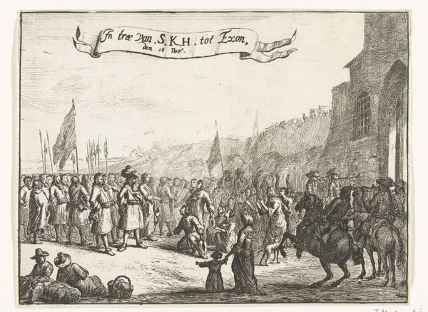 This etching, “De prins ontmoet de hertog van Grafton, 1688,” was created by an anonymous artist and is currently held at the Rijksmuseum. Observe the stark lines and detailed hatching that shape this historical encounter. The composition is carefully structured; lines of soldiers and onlookers frame the central meeting, creating a dynamic yet ordered scene. The textures are evoked through the varying densities of line work. The artist uses a semiotic vocabulary to convey power and status. The elevated perspective, from which we view the procession, combined with the orderly arrangement of figures, conveys authority. Consider how the formal elements not only depict an event but also subtly reinforce a narrative of dominance and control. Ultimately, this print's enduring quality lies in its visual arrangement of forms, not merely depicting a meeting, but representing the very structure of power.