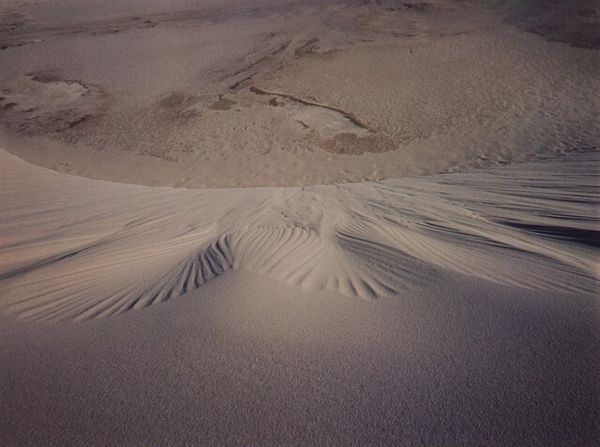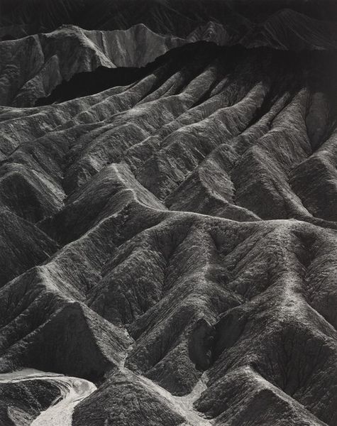 Curator: Look at this captivating image! This is "Sand Dunes, Oceano, California," a gelatin-silver print by Ansel Adams, likely created sometime between 1950 and 1981. Editor: Immediately, I'm struck by its starkness and rhythm. There’s an almost hypnotic quality to those repeating lines, and it seems to portray something primal, quiet and monumental all at once. Curator: Yes! And I think its importance lies not only in the aesthetics but the time in which it was made. Consider this alongside the rise of environmental consciousness and the Cold War. Adams documented these landscapes as pristine spaces threatened by development, and, on another level, as timeless bulwarks to sociopolitical upheaval. His commitment to untouched wilderness had very tangible political consequences and connections. Editor: The image is archetypal. We see wind-sculpted patterns in sand. Dunes appear in myths and stories worldwide, carrying heavy symbolism across cultures; themes of impermanence and transition are prevalent. Those shifting sands remind us both of life's fleeting nature and the patient work of natural forces beyond human control. Curator: Exactly! Also consider that Ansel Adams, although well known for championing conservation through these types of nature shots, has often been criticised for the limited scope of his images; particularly the ways that class and race operated within landscape photography, given Adams’s position in America as a white photographer of the upper middle class. He had blind spots and there are criticisms, as with most artistic work, for a number of good reasons. Editor: Perhaps the simplicity is the strength. By stripping away the excess, focusing purely on form and texture in monochrome, Adams directs our focus inward as much as outward. It makes you ponder your place within the bigger picture, in both literal and metaphorical terms. Curator: It’s interesting you point that out. Maybe he’s nudging us to reconcile with those tensions and complexities you described while searching for the sublime through a commitment to documenting the landscape! Editor: I’d agree! This really made me reflect on how landscapes affect our unconscious understanding and, conversely, the marks our own experiences leave upon a space.