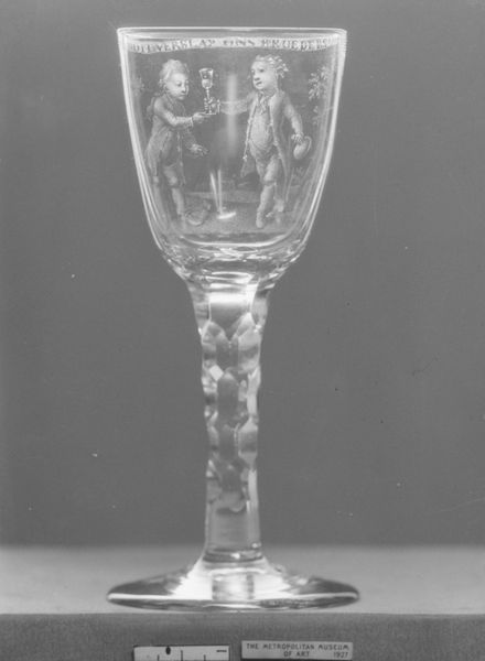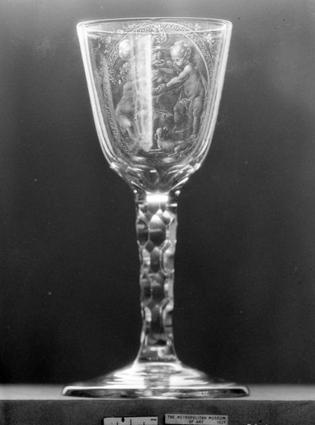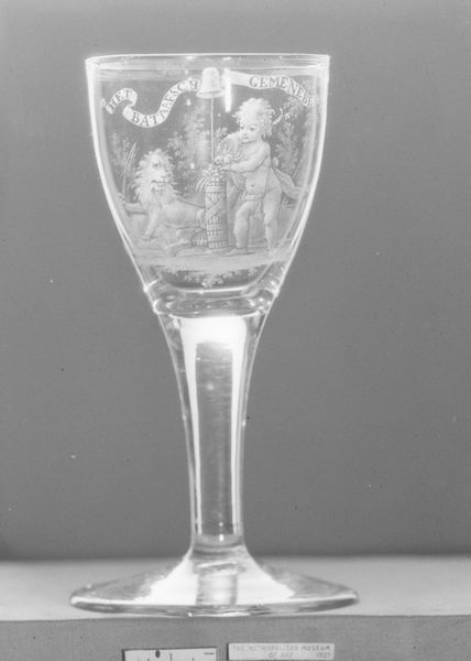 This is a wine glass, made from glass and decorated by David Wolff sometime in the late 18th century. The Rococo style glass is decorated with allegorical figures, putti holding a banner with the words 'Vriendschap, Liefde en Vrede' – 'Friendship, Love and Peace'. This was a period in which the Dutch Republic was in decline, losing out in naval wars with Britain. It was a time of growing social inequality, with the wealth concentrated in the hands of a few merchant families. The ideals of the Enlightenment were spreading, but there was also a strong sense of nostalgia for the Golden Age of the 17th century. By drinking from a glass like this, people were celebrating the bonds of friendship and family, perhaps in response to the political instability of the time. The Dutch middle class used art to define and celebrate their identities. We can learn more about this context by consulting historical documents such as letters, diaries, and newspapers, as well as books on the history of the Netherlands. These can provide a better understanding of the social and cultural forces that shaped the art of this period.