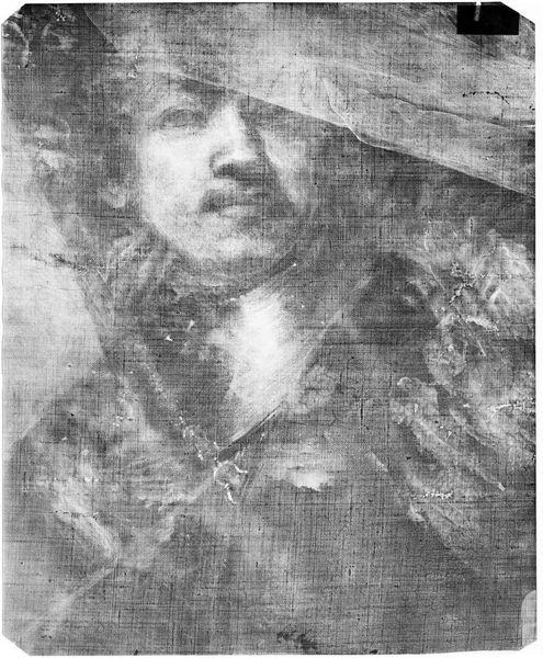 Curator: This is an X-radiograph of "Portrait of a Man," originally by Bartholomeus van der Helst. The film itself measures 14 by 17 inches. It's haunting, like a ghost trapped in canvas. Editor: The texture is what immediately strikes me. You can see the weave of the canvas so clearly. It exposes the material support, disrupting our conventional viewing of the painting. Curator: Absolutely. Beyond the literal weave, think of the social fabric. Portraits were potent symbols of status, and this one carries echoes of Dutch Golden Age values, filtered now through the ghostly lens of technology. Editor: The X-ray reveals the underpainting—the artist’s hand at work, the labor beneath the surface. It democratizes the image somehow, peeling back layers of artifice. Curator: And it's a reminder of mortality, isn't it? We see the material, but the portrait subject becomes spectral, an image of a man mediated by science. Editor: Yes, a fascinating look at process and the passage of time, made visible through material investigation.