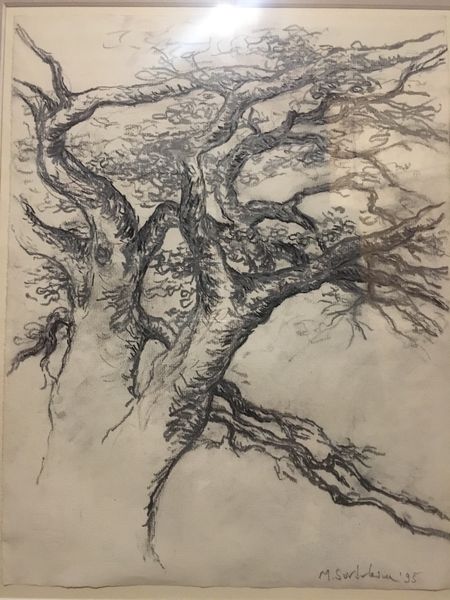 Editor: This drawing, attributed to Czóbel Béla from 1956, titled "Fa," which means "tree" in Hungarian, appears to be a pencil sketch. The swirling lines give it a very dreamlike, almost unsettling feeling. What can you tell me about the context of this drawing? Curator: It’s fascinating to see Czóbel, primarily known for his vibrant paintings, explore this more intimate, almost hesitant style in a simple pencil sketch. Sketches like this give us insight into the artist's process, particularly regarding how Central European artists navigated representing the natural world while also participating in global, modernist movements. Do you think that an illustration, particularly an understated one, offered him a unique freedom of expression compared to painting? Editor: Possibly! Perhaps it allowed for a directness that grander works didn't. The subject matter seems fairly straightforward – it’s just a tree – but then I see what could almost be a human profile within the branches at the upper left... What do you make of that superimposition, intentional or not? Curator: Exactly! And the question of intention is key, isn’t it? The suggestion of a human presence alters our perception of the tree; suddenly, it becomes a symbolic figure or portrait. What does it mean, in the mid-20th century, to subtly embed the human figure within the landscape like this? Perhaps Czobel wanted to question the classical depiction of humanity in the modern age. What kind of tension do you perceive between the public role of the artist versus the solitary nature of this sketch? Editor: I see the tension! Knowing he mainly painted colorful pieces, it’s like he was speaking a different visual language when "off duty." That really reframes how I think about the artist’s entire body of work. Curator: Precisely! And considering its creation as a possible illustration, it forces us to ask: what stories were Czóbel trying to participate in, and how does that influence the image of the solitary tree? It adds a layer of social commentary that would be absent otherwise. Editor: I’m struck by the connection between what might be considered a preliminary drawing, versus a finished, displayed work of art. Curator: And perhaps that distinction breaks down when the “preliminary” drawing speaks volumes about the artist’s hand in society!