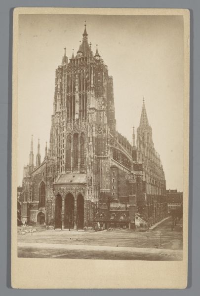 Curator: What strikes you first about this gelatin silver print, captured sometime between 1850 and 1880, by Johann Heinrich Schönscheidt? It's titled "Gezicht op de westzijde van de Dom van Keulen"—A View of the West Side of Cologne Cathedral. Editor: The overwhelming sense of... incompleteness. The intricate scaffolding veiling much of the facade really dominates my visual field here. Curator: Indeed. Construction. Always becoming. Cologne Cathedral carries immense cultural weight. Its very existence embodies resilience and determination, given that its construction spanned over six centuries! Editor: You’re right. That incompleteness reframes how I see it, actually. It becomes a potent symbol. It isn't just a view of a building, it is an expression of sustained communal effort—generations building upon the work of the preceding one. But formally, look at the sheer volume and how its texture and verticality contrast with the urban roofscape in the foreground, with such tightly nested townhouses. Curator: Exactly! In the nineteenth century, this photograph of the cathedral under construction served as an icon of national ambition. To visually present this structure, which held the relics of the Three Magi, suggests a symbolic unification, or more aspirationally a *yearning* for unity amidst fractured principalities. Even the tones of this photo remind one of age, memory, a sepia tone washing over cultural identity and religious narrative, don’t you think? Editor: Yes, the subdued tonality definitely lends it a historical weight, almost as if time itself is baked into the print, obscuring the specifics into one holistic image. Curator: And note how Schönscheidt positions the viewer--we’re offered not just a scene but almost an invitation into that long and turbulent building narrative. What do you think he captures and transmits with this photograph? Editor: To me, the photograph shows both something deeply structured, and something organic as well; a visual structure revealing how human purpose imposes itself, bit by bit, upon the flow of existence. And yet it reveals that purpose will still evolve. Curator: A structure pregnant with significance—a visual bridge not only to the sacred past, but an unfolding, living heritage in continual construction. This image now offers all these meanings for future viewers, across temporal gulfs.