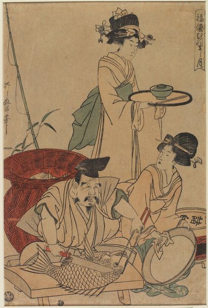 This woodblock print by Chōbunsai Eishi, made in Japan, presents Ono no Komachi, a famous poet, in a series depicting her in fashionable scenes. Here, she washes a copybook in a tub of water, attended by two other women. Eishi worked during the Edo period, a time of economic growth and strict social order under the Tokugawa shogunate. The arts flourished, but were also subject to censorship. Prints like this, part of the "ukiyo-e" genre, often depicted idealized versions of women, actors, and famous tales, subtly commenting on contemporary society. Here, Komachi is placed within a very contemporary setting with up to date fashion, as we can see by the contemporary hairstyle. Understanding this print requires considering its cultural context. Research into the Edo period's social structure, the role of women, and the popularity of the Komachi legend is essential. By examining these sources, we can move beyond a purely aesthetic appreciation and understand the print's commentary on the social norms of its time.