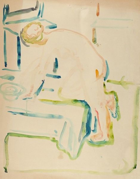 Editor: This is Camille Pissarro's "The Artist's Mother in Bed," an undated watercolor. There's such a delicate quality to the application, a lightness. What visual elements strike you most when you look at it? Curator: The interplay of light and shadow is compelling, particularly in how it defines the form of the figure beneath the covers. Notice the subtle gradations of color used to render the volume. The composition guides the eye—do you see how the diagonal line formed by the bedframe directs our attention to the face? Editor: Yes, and the color palette feels very cohesive, with these muted, almost pastel shades. I am interested in the way the negative space works with the mass in the work. Curator: Precisely. Pissarro uses the fluidity of the watercolor medium to create a sense of atmosphere. The translucence allows the underlying paper to interact with the pigments, which further contributes to this visual effect. Editor: So, you're saying it is the materiality and not necessarily the intimate subject matter that commands attention? Curator: While the intimacy is present, formally, the work demonstrates Pissarro's concern with purely optical effects, playing with how color and light create form, how a painting generates a sensory effect by its pure artifice. Editor: It is so interesting how you can see form differently from such varying viewpoints. Thinking of color and light shifts my understanding. Curator: Indeed. Analyzing formal properties opens fresh paths. Consider how the arrangement and treatment affect our overall aesthetic response. Editor: I hadn't really considered it that way, thank you! I will view Impressionist paintings through that lens now.
