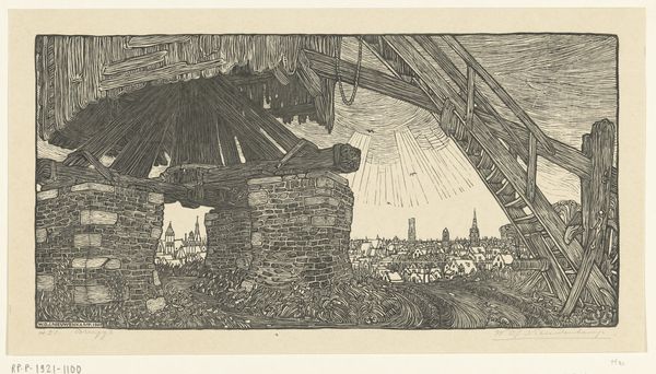 Wijnand Otto Jan Nieuwenkamp made this print of a windmill's base in Bruges using etching techniques. It shows us not just a structure, but a stage in the city's life. The image creates meaning through its specific depiction of Bruges, likely made in the late 19th or early 20th century. At this time, Bruges was experiencing a cultural reawakening, often referred to as a "Bruges la Morte," a revival of its medieval past. We see this reflected in the romanticized depiction of old structures against the city skyline. But the angle from below the structure also suggests decay and the effects of time. Windmills, once central to the economy, were becoming obsolete. The city was changing. Understanding this print means digging into the historical context: economic shifts, artistic movements, and local Bruges' cultural identity. By exploring archival materials, local histories, and the artist's other works, we begin to appreciate how art captures and comments on the currents of societal change.