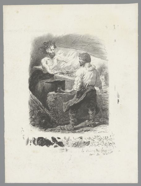 Curator: Standing before us is a work by Wilhelm Leibl, an 1868 pencil drawing titled, rather pointedly, "The Critic," a name which hints at its confrontational spirit. What’s your take as you observe it? Editor: My first reaction is… well, these figures seem to be caught in a rather intense power dynamic, right? There’s a definite feeling of unease emanating from this roughly sketched scene, though with so few pencil strokes it also possesses a kind of unfinished grace. Curator: Precisely, though this being Leibl, "unfinished" is, I think, rather beside the point. Look at how precisely he captures the seated man's posture versus the more complete image of the so-called "critic", his index finger accusing the former as he stares down with what might be an aristocratic judgement! I would wager this piece serves as a quiet rebuke to the gatekeepers of artistic taste. It certainly speaks to anxieties around evaluation. Editor: I agree that the piece highlights tensions of class. The standing figure seems to represent the establishment or bourgeoisie. In this drawing we have what looks like an upper class person critiquing a tradesman working on a mundane wooden cart; they exist in very different social spheres. It's not difficult to read their expressions. It feels quite critical but also hopeless somehow. Curator: Ah, hopeless--that’s the kernel, I think! I see not just criticism but also the resignation to it, the understanding that taste, and by extension, opportunity, are shaped by these powers that be. There’s a fatalism in those hastily scribbled lines... even the very gray tone throughout conveys such emotional weight. Editor: And the fact that it’s a sketch, almost a preparatory work, amplifies that, doesn’t it? Like we’re seeing a fleeting moment, a glimpse into the daily grind of hierarchical societal pressures and how such imbalances can stifle human progress through criticism of others who are simply trying to survive. The lack of clear setting places emphasis on these character portrayals as if no backdrop matters other than social context. Curator: Well put. It resonates deeply because while ostensibly Leibl depicts an interaction between two men within 19th-century Bavaria, he taps into something far more universal: that fear of judgment and its lingering sting, one that extends from those early, harsh rebukes in the schoolyard to the sting of formal art criticism that affected his sales! This is what Realism does best--using one moment to amplify so many others. Editor: Indeed! Leibl reminds us of how systems of power often leave indelible marks upon individuals and, crucially, how artistic expression is necessary not just as creation, but protest. Curator: An essential reminder and the artist's greatest power--and maybe, ultimately, why we're still moved by his simple yet powerful sketch more than a century later.