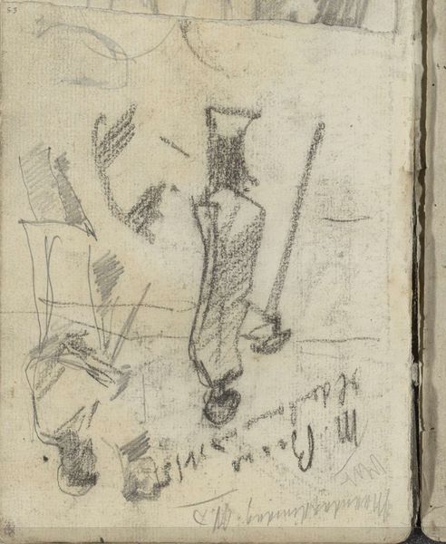 Curator: Looking at this drawing, there’s a nervous energy about it. What catches your eye immediately? Editor: A frenetic feeling—it is gestural, as if capturing something fleeting. The overlapping lines of the horses...they’re like layers of exertion. Curator: This graphite drawing, entitled "Horses in a Landscape, possibly Dunes," was created by George Hendrik Breitner between 1881 and 1883. Editor: Dunes...interesting, because despite the seeming lack of detail, I perceive vastness. I sense the animals, for sure. But what I want to ask, is about Breitner’s access to these animals. These horses aren’t work horses…so who could have access to so many horses at play in a Dutch landscape? What does this tell us about access to freedom and leisure at this time? Curator: An interesting way to interpret access and ownership, for sure. What intrigues me about Breitner’s style here is how he evokes movement with minimal lines. The clustered horses aren't just standing there—there's implied interaction, even a kind of dynamism that reminds me of similar depictions throughout art history, from the cave paintings at Lascaux through the Renaissance masters. But this image appears to abandon centuries of technique! Why? What symbols were he aiming for? Editor: Yes, exactly! And what does choosing this moment represent, during a time of rising anxieties about the urban experience, increasing poverty, the struggles of workers rights. Were horses a symbol of some longing or resistance? I love how, even with its sparseness, this work ignites such questions about place and power. It resists traditional notions of artistic skill while quietly evoking all these different levels of analysis. Curator: Yes, "resistance" is the right word. It’s also easy to assume such drawings of that era should feel 'resolved'. Breitner defies that, embracing uncertainty and hinting at realms beyond our immediate vision. Editor: A powerful piece! It highlights how even a seemingly simple sketch can hold complex commentary about social power and historical transformation. It opens avenues for dialogue we often overlook in such works. Curator: Absolutely, and seeing the endurance of horse symbology alongside subtle but powerful stylistic changes makes the experience a memorable one for me.