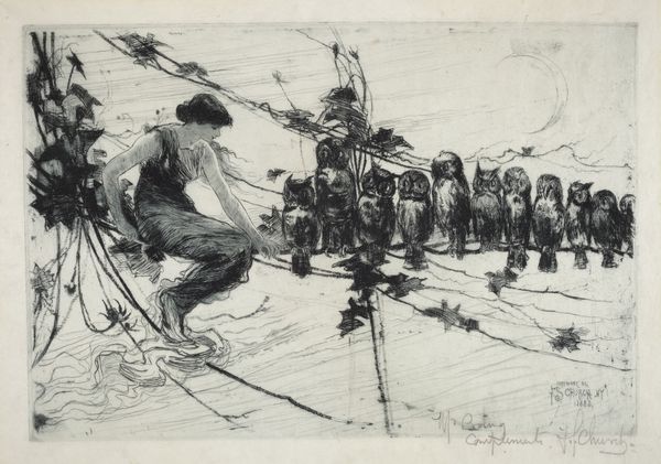 Curator: What we're looking at is a 1918 ink drawing titled "Frische frohliche Krieg," or "Fresh Cheerful War," by Willem van Schaik. I wonder what that title implies about what’s going on here. Editor: Well, "fresh" and "cheerful" certainly aren't the first words that come to mind. I'm seeing weariness etched into these figures. The monochromatic palette and frantic cross-hatching give the piece a stark, desolate feeling. It’s anything but fresh, really. Curator: I agree. It feels heavy, almost oppressive. Maybe Van Schaik intended a bitter irony with that title? The figures seem huddled together in a bleak landscape, rifles beside them – suggesting a temporary respite in some conflict. Their postures—slumped, heads bowed—speak of exhaustion and resignation. Editor: Irony seems likely, especially considering the context of 1918. The war’s end was in sight, but after immense suffering. These figures, perhaps peasant women turned soldiers or auxiliary forces, are framed against what seems a typical pastoral landscape, a style that here becomes indictment of a world turned upside down. Curator: Right, a real break from typical realism—Van Schaik manages to use these combined styles to create an expressive portrait of a collective experience, don't you think? And that level of expressivity gives a disturbing energy to it. You see this gathering of anonymous figures who have endured so much they can barely acknowledge one another anymore. It's haunting. Editor: Absolutely. There’s also something about the scale that enhances that feeling. As a drawing, it pulls us in close to their silent grief, away from grand narratives of heroism or victory. The lack of color concentrates everything into this powerful contrast between light and shadow. I keep wondering, who are these women, and what's become of them after this pause in hostilities? Curator: That’s it exactly, isn't it? Van Schaik avoids sentimentalizing their experience, forcing us to confront the stark reality of war's impact on ordinary lives. A stark, visual reckoning... Editor: Yes, this artwork has definitely shifted my understanding of this period. The women were not passive in war. They’re here— exhausted, grieving, maybe forever changed, but visible. Curator: Exactly. Now I am not sure I will hear the word fresh the same way ever again!
