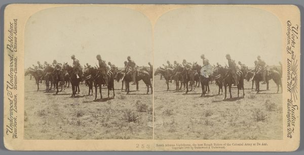This is a stereoscopic image by Underwood & Underwood, presenting a staged scene of the British cavalry regiment preparing to advance towards Bloemfontein in South Africa. The composition emphasizes linear perspective. Rows of soldiers and horses receding into the distance create a sense of depth and imposing order. The limited tonal range mutes the details, rendering the scene almost monochromatic and focusing our attention on the forms and their arrangement. The visual structure invites a semiotic reading. The regimented lines and uniformity of the soldiers become signs of military power and colonial ambition. The image, however, also destabilizes any straightforward reading of heroic conquest. The hazy atmosphere and the staged nature of the scene introduce a sense of unreality, challenging the viewer to question the values and categories it represents. The stark lines serve as a visual metaphor for the rigid structures of power. Artworks like this invite us to continuously reinterpret and question their meanings in dialogue with historical and cultural contexts.