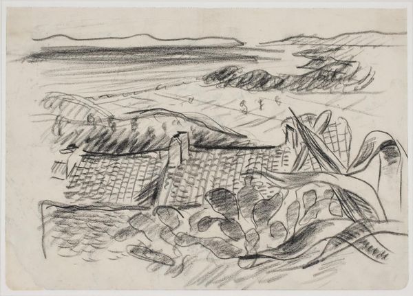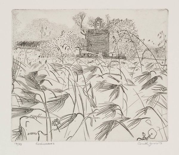 Editor: We're looking at Franz Radziwill's etching, "Farm (Memory of Dangast)," from 1923. There's something quite stark and unsettling about the composition, even though it depicts a seemingly simple rural scene. What do you see as its defining visual characteristics? Curator: Primarily, I see a complex interplay of line. Notice how Radziwill employs etching to delineate every form, imbuing even seemingly empty spaces with a graphic intensity. The formal elements operate at a tension. Editor: Tension? Curator: Indeed. Observe the conflicting uses of perspective, a distorted realism perhaps. There's a flattened quality in the background juxtaposed with the implied depth created by the receding fence in the foreground. How do those contradictory visual cues speak to you? Editor: I hadn't noticed that deliberate conflict! Now that I see it, it makes the image feel less stable, more… precarious. Curator: Precisely. The artist disrupts a seamless reading, doesn't he? That’s part of the strategy. Then observe the hatching and cross-hatching, creating tone and texture, activating surface variations of the print. Editor: It’s amazing how much information he conveys with such a limited palette and relying solely on line work. I initially missed how complex it was! Curator: Exactly. It invites us to consider the intrinsic nature of etching as a medium, and how Radziwill manipulates it to evoke a mood far beyond just representing a farm. We focus not only on "what" is represented, but "how". Editor: I now see it’s not just a quaint memory. The artist transforms it through his rigorous and challenging formal choices. Thanks, I’ll remember to examine the technical aspects more carefully in future works. Curator: You are welcome. Understanding how artists make choices adds considerable layers of appreciation and understanding of the works in front of us.