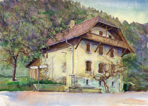 Curator: I'm immediately struck by how this watercolor rendering of a Swiss farmhouse almost glows. There's such a charming interplay of light and shadow. Editor: Indeed. This is "Old farmhouse in the Swiss village of Saint-Triphon" created in 2003 by Hubertine Heijermans. It’s an outdoor watercolor piece depicting daily life in a small Swiss village. Genre painting like this gained importance in the late modern era and the role of the artist changed. Curator: It's interesting how the smoke rising from the chimney creates a subtle link between domesticity and nature. The home and the environment in symbiosis; it certainly communicates warmth. I wonder about the psychological comfort associated with returning to one’s village. Editor: Smoke does function as a powerful, almost primal symbol: hearth, home, continuation. The rendering itself reinforces this: The realism here creates an inviting familiarity; Heijermans captures details in such a way as to render the specific location generic in meaning—and universalize the feelings around 'home.' Curator: The style evokes nostalgia for simpler times, contrasting with a world evermore focused on progress and technology. Realism reminds me of the shift from celebrating great figures in monumental artworks, to more common folks captured in scenes of day-to-day existence. Editor: That reminds me how Heijermans used "plein-air", meaning, directly painted from nature; she, literally, extracted what was external to produce internal reflection, not just about a village, but perhaps an internal return too. We often use landscapes to see internal worlds... the village and what it means. Curator: Absolutely. Heijermans makes us pause and find meaning in simplicity and in our roots, offering us this little jewel to remind us how art provides critical pause to everyday hustle. Editor: Right. Hubertine, via watercolor and village, proposes reflection: an image for thinking more about how humans give significance to, and find meaning from the idea of ‘home'.