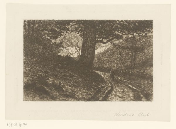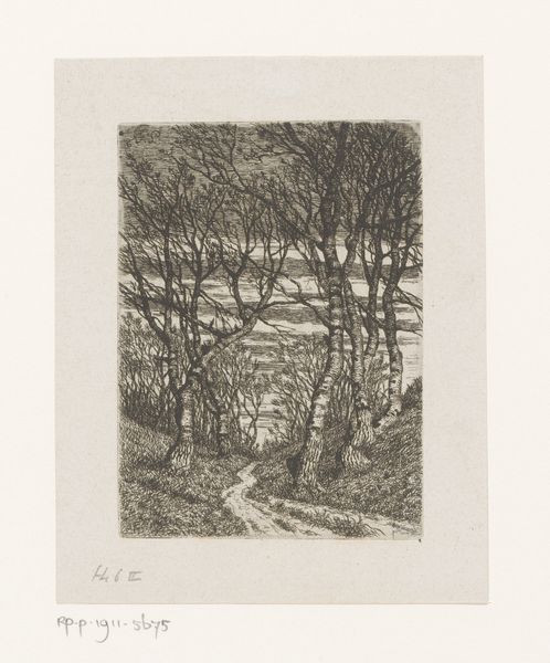 Willem Witsen made this etching, "Landscape with Trees and Fence," with ink on paper. The image reflects the Dutch art movement known as the Amsterdam Impressionism, with its loose brushstrokes and focus on capturing the atmosphere of a scene. This artistic trend emerged in the late 19th century in the Netherlands, and it was an important moment of questioning the art institutions, especially the established art academies, and their rigid rules for painting. Here, Witsen captures a very quiet moment in the Dutch landscape; we can see a row of trees behind a wooden fence, and a path in the foreground. The image is made of layered impressions of light and shadow. It is a study in depicting this flat, pastoral land without idealising it. Historians investigate such art works by tracing the biographies of artists, delving into exhibition records, reading period publications, and studying the formation of art movements in order to understand how they comment on the social structures of their time.