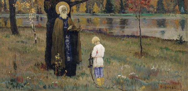 Mikhail Nesterov painted "Venerable Sergius of Radonezh" using oil on canvas, capturing a pivotal figure in Russian monasticism. Note the halo, an immediate signifier of holiness, yet rendered with a subtle, earthly glow, setting Sergius apart, imbuing him with divine presence. Sergius holds a staff, a symbol deeply rooted in religious and mythological contexts. It echoes the shepherd's crook, and the scepter of authority, evoking images of leadership and guidance seen across cultures, from ancient Mesopotamia to the Christian tradition. Observe how the staff grounds Sergius, connecting him to the earth, while the halo elevates him towards the heavens. This mirroring reminds us of the cyclical nature of symbols, forever resurfacing, evolving, and taking on new meanings across historical contexts. Such imagery taps into a collective memory, engaging viewers on a subconscious level.