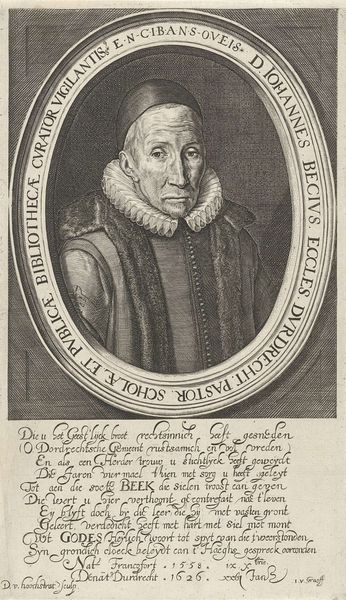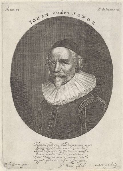 Curator: Immediately striking is the formal composition, the stark contrast between the crisp lines and the tonal backdrop...it feels meticulously structured. Editor: Indeed. What we have here is a metal engraving dating from 1652. It is entitled “Portret van de advocaat Johan van den Sande,” or, in English, "Portrait of the lawyer Johan van den Sande." The artist was Salomon Savery. Curator: Note the skillful use of the oval frame, anchoring the sitter's presence, setting apart a realm of dignified observation and separating from the external background. Editor: Van den Sande, being a lawyer, was presumably of high standing in society. Portraits during the Baroque period were frequently used to project not only likeness but also status. Look at the texture rendered on his cap and clothes. They almost signal that very wealth, influence and status! Curator: That’s a keen point. The textural detail, or should I say rendering, gives weight to the overall composition, rooting it, anchoring the abstract play of line with tangible form. The crispness almost serves a diagram. Editor: This work finds itself in the collection of the Rijksmuseum. It serves as an example of how the burgeoning Dutch Republic relied upon printed portraits to memorialize—and sometimes idealize—its leading citizens. Van den Sande’s legal expertise would have been essential for structuring a fledgling nation. Curator: I appreciate the portrait’s power and reserve, especially how the rendering emphasizes the formal elements—the ruffled collar, the cap—as signifiers of vocation. The line quality speaks to intellect. Editor: To step away from our points: art provides such opportunity, doesn't it? It invites us to engage with both aesthetic considerations and tangible historic elements. Curator: Absolutely, offering a balance in discourse and practice. It’s why engaging with these formal decisions continues to draw insight to historicized practice.