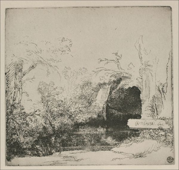 Editor: Here we have Rembrandt van Rijn’s “A Brook with a Grotto and a Boat,” an etching in ink from 1645. It's a rather unassuming landscape at first glance, but I find the density of the marks strangely compelling. How do you interpret this work? Curator: This seemingly simple landscape vibrates with the echoes of cultural memory. Note how Rembrandt positions the grotto; it’s not merely a geographical feature but a symbolic space, resonating with classical ideas of refuge, contemplation, and even the divine feminine. Do you notice how he renders the surrounding trees? Editor: Yes, they are drawn with such energy, almost vibrating as you mentioned. Curator: Precisely. They frame the scene, guiding our eyes towards the central mystery of the grotto. This isn’t just a pretty scene; it's an invitation into a symbolic realm. The grotto serves as a potent emblem of hidden knowledge, rebirth, and the enduring power of nature. We respond viscerally because, for centuries, the 'wild' represented spaces for the divine or mysterious - even fearful places to enter. Editor: So the sketch-like quality almost enhances that feeling of a hidden, slightly dangerous place? Curator: Absolutely. The etching medium allows for a certain level of ambiguity. It allows for layers of symbolism which are open to different readings according to an individual’s experience and understanding. Editor: That’s fascinating. I hadn’t considered how the style and the symbolism were so intertwined. Curator: Indeed. Looking closely allows us to unravel those interwoven layers. I'm glad we had this opportunity to consider the emotional weight of such simple marks on paper.