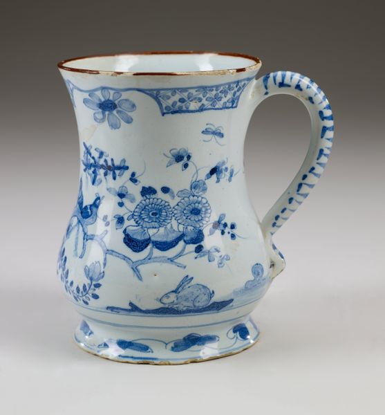 Curator: Here we have a piece identified as an "Ewer with floral design" made of earthenware, and dating back to the 12th or 13th century. It is currently held in the collection of the Minneapolis Institute of Art. Editor: My initial reaction is one of understated elegance. The soft celadon glaze paired with the dark floral motifs creates a really delicate visual balance. The vessel's form feels quite traditional, almost timeless. Curator: It is. This type of ewer speaks volumes about the societal function of ceramics within Islamic art during this period. Its presence indicates sophisticated trade networks that enabled the movement of raw materials, techniques, and, most importantly, artistic concepts. These objects were more than utilitarian items; they held a social cachet and facilitated community rituals and hospitality. Editor: Indeed. Focusing solely on form, consider the swelling body of the ewer juxtaposed with the slender, almost bird-like spout and the arching handle. These contrasting lines offer an active visual pathway for the viewer's eye. The applied decoration seems almost purposefully subdued in register, as though intent on enhancing the object's physical form rather than overshadowing it. Curator: The floral designs weren't simply aesthetic flourishes, mind you. These botanical elements might be deeply symbolic. We must consider the courtly cultures where the use of floral decoration—its availability and application to these works—served to bolster and promote status and elite identity. Editor: Absolutely. Looking again at the composition, the horizontal band of curved strokes just below the neck creates this energetic rhythm. Do you think this piece carries the same symbolic value in the absence of the full cultural context in the present day? Curator: That's a complex question, as meanings change. Though direct access to 12th-century perspectives eludes us, appreciating the artistic ambition invested in these kinds of pieces remains relevant. We are invited to look again at cross-cultural movements, innovations in the application of ceramics and the social life of such designs. Editor: I suppose that after our conversation, it now seems the form is perhaps less modest than I initially perceived! Curator: Exactly, its story resonates far beyond the material itself.