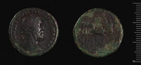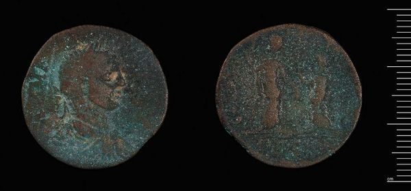 Editor: This is a "Dupondius?" of Trebonianus Gallus. It's at the Harvard Art Museums, though the date isn't specified. It looks so worn and ancient... I wonder what stories this coin could tell? What catches your eye about this piece? Curator: Oh, it’s like holding a whisper from the past, isn't it? The green patina, like verdigris tears, speaks volumes of time and burial. I imagine it exchanging hands in bustling Roman marketplaces. Can you almost hear the bartering? I wonder what it purchased? Editor: Maybe some olives and bread? It really brings history to life. Thanks for sharing that. Curator: My pleasure! It's amazing what stories objects can tell, if you let them.