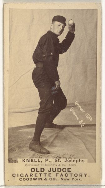 Editor: So, here we have an albumen print from 1888, a baseball card really, featuring George F. "Piano Legs" Gore. It was part of the "Old Judge" series by Goodwin & Company. The sepia tones give it such an antiquated feel. It makes you wonder what baseball was really like back then. What do you see in this image, something beyond just an old baseball card? Curator: Indeed! This isn't just a photograph; it's a potent symbol of emergent celebrity culture and industrial expansion. Note how Gore, the athlete, is presented almost like a classical hero – think of the "discus thrower" statue, frozen in action. It evokes the human body as strength, power, and dynamism but repackaged. But then consider the backdrop of the "Old Judge Cigarette Factory". Do you see a connection, an alignment of ideas? Editor: Now that you point it out... There’s that tension between athleticism and, well, smoking! Curator: Precisely. One represents vitality, the other, vice, yet they are coupled here. It highlights the cultural narrative of the time. The "Old Judge" series attached itself to the virility of sport, aiming to associate the cigarette brand with these celebrated athletes. Think of these cards as almost talismans or small portraits of ideals and aspirations of late 19th-century America. Consider it. What meaning does linking "heroic" feats with common consumption have for you today? Editor: I see, a visual endorsement. It's an early form of advertising, tapping into popular figures to sell a product, using heroes to promote unhealthy living in this particular example. Very interesting. Curator: Precisely. So while at first glance this may just seem to be a vintage baseball card, what layers of interpretation can now arise for you when thinking about the cultural and psychological messages embedded here? Editor: That’s true, so much is encoded in it; more than meets the eye at first glance. I think I have a better handle on how photography serves both a representative and symbolic function now, preserving a moment while reinforcing an idea. Thank you.