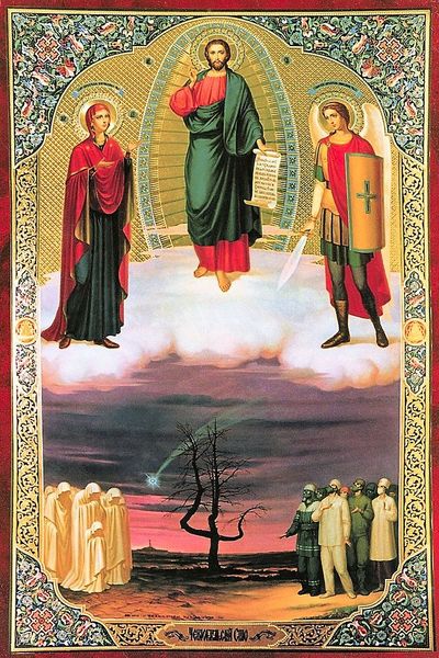 Editor: So, here we have Nicholas Roerich’s “Temptation of Christ,” painted in 1933, using oil paints. I’m struck by the intense, almost ethereal quality of the light, especially around Christ. What draws your eye when you look at this piece? Curator: Immediately, the interplay between light and shadow, good and evil. Note how Roerich positions Christ bathed in heavenly light atop the mountain, contrasting with the shadowy, almost bat-like figure of temptation lurking nearby. How does that visual opposition strike you? Editor: It definitely creates a sense of dramatic tension, a very stark duality. The positioning, with Christ so high above the city below and seemingly separate from the darker figure, amplifies that. Is the city symbolic as well? Curator: Absolutely. The city, rendered in cool blues and grays, likely represents worldly temptations and power. Christ’s rejection of these temptations is symbolized by his physical distance and elevated position, the mountain signifying spiritual ascent. What symbols do *you* notice and how might they function within the artwork? Editor: The Chi Rho symbol on the mountain stands out, directly associating the location with Christ. I also see that Roerich uses a limited palette but its hues are saturated. What does that suggest to you? Curator: Exactly. This focused use of color emphasizes the spiritual and emotional intensity of the scene, creating a sense of otherworldly conflict within a symbolic landscape. I see the halos of light here echo that otherworldly element... What are your final thoughts? Editor: I appreciate how Roerich used visual symbols to create a sense of both grandeur and internal struggle. The limited palette and stark contrast create a memorable image that resonates even today. Curator: Indeed. The "Temptation" becomes not just a biblical story, but a symbolic representation of inner challenges.