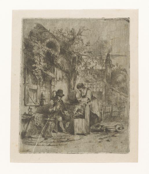 Adrien Joseph Verhoeven-Ball made this etching, titled "Street view with woman scouring a kettle," during the 19th century. Here, we see the symbol of domesticity, with the woman meticulously cleaning a kettle. This image is a window into the everyday life of the time, and is reminiscent of similar images from Dutch Golden Age paintings. This act of cleaning is an archetypal gesture seen throughout art history, echoing the cleansing rituals of ancient civilizations. It mirrors the purification rites of the Vestal Virgins, who maintained sacred flames, their purity reflected in the cleanliness of their tasks. The kettle, a mundane object, becomes imbued with deeper meaning, representing the cycle of care and nurture inherent in domestic life. The act of cleansing extends beyond the physical, tapping into our subconscious desire for order and purity. The woman’s focused labor is a powerful symbol, resonating across centuries, reminding us of the continuous cycle of life and the enduring human need to bring order to our world.
