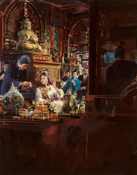 Editor: Here we have “Waitresses at Caffe Reggio” by Vincent Giarrano, an oil painting rendering an interior. It’s so rich in detail, with the reddish-brown walls contrasting with the activity near the coffee counter. What captures your attention most in this piece? Curator: Oh, this painting, doesn't it just make you want to lean in close? What pulls me are those little human stories humming within its frame. See how the waitresses occupy their own quiet corners of labor? It’s a painting of captured breaths, really. The steam from coffee mingling with hushed conversations, all framed within the most gorgeous, warm color palette. You almost can smell the espresso, right? But how much is “Realism,” and how much is constructed to communicate the “feeling” of the place? That’s the fascinating question that hangs in the air. Don't you think? Editor: I can see that. I initially read the details as realism, but perhaps that's only part of the story. Curator: Yes! Notice the impasto strokes, thick and generous. It’s like Giarrano is saying, "I'm not just showing you a place; I’m giving you the very substance of its being.” The setting might evoke a sense of classicism, a timeless quality found in old European cafes, but Giarrano pulls it into our moment. He wants you to see that beauty hides in plain sight. Editor: That makes so much sense. So it is less about exact replication and more about an emotive interpretation? Curator: Exactly! It reminds us to appreciate the subtle beauty within our everyday routines, you know? This isn't just about coffee; it's about connecting—with each other, with art, with the quiet moments that fill our lives. Editor: I definitely see it now! This makes me think differently about how I perceive “everyday” scenes. Thanks for illuminating this one. Curator: My pleasure. Each artwork offers us a new lens; isn’t it delightful?