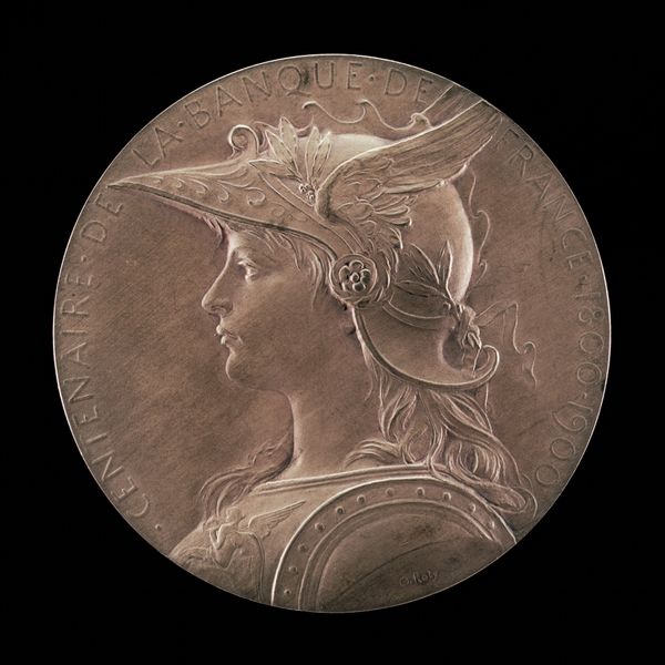 Curator: Louis-Oscar Roty designed this relief sculpture entitled "Centenary of the Bank of France," circa 1900. You can find it here at the Metropolitan Museum of Art. Editor: My first impression is one of controlled strength. The piece is formal, with this stoic female figure, yet the details in her armor and helmet suggest movement, almost a latent energy. Curator: Note how the visual vocabulary borrows from Neoclassicism, popular at the turn of the century, but also serves specific symbolic ends for a young Republic finding its footing after years of revolutionary unrest and political turmoil. Editor: Exactly! The woman, helmeted, looking almost like Athena, embodies not only France but also perhaps abstract notions of wisdom, stability, and financial security – key ingredients for confidence in this moment. Even the choice of relief sculpture – a format closely tied to ancient coinage and state emblems – underlines that connection. Curator: The artistry involved in rendering the inscription in such minute detail given the medium deserves appreciation. Also consider the implications of state-sponsored decorative arts; objects such as these become embedded in social ritual, reaffirming notions of value, labor and nationhood itself. Editor: And her gaze is fixed—looking forward. I wonder what anxieties or aspirations the bank hoped to project onto its populace at the time with this commission. Were they successful in crafting an accessible image for everyday consumers? Or did the visual language, steeped as it is in Greco-Roman aesthetics, widen the gap with ordinary life? Curator: Interesting to note also is the use of such historical imagery at the dawn of industrial capitalism and an age of mechanized production. The medal links old regimes with modern aspirations by portraying French commerce through carefully calibrated historical associations. Editor: I agree. Reflecting on Roty’s work helps to reveal just how much visual symbols continue to shape—and sometimes subtly manipulate—our understanding of abstract concepts like “finance” and “national identity.” Curator: For me, understanding the means of production in such commemorative and seemingly benign forms shows us the depth of control wielded over collective historical understanding, an interesting intersection of politics, economics and artistic execution.