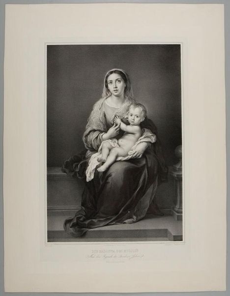 Curator: Let's consider this engraving, Madonna and Child, by Tomas Raggio, currently held at the Harvard Art Museums. Editor: The first thing that strikes me is the soft texture achieved through the engraving process. It almost feels like looking at a charcoal drawing rather than a print. Curator: Indeed, Raggio's technique emphasizes the tonal range, creating subtle shifts in light and shadow that define the figures. The halo, for instance, is suggested rather than explicitly delineated. Editor: And the draping fabric, seemingly mass-produced, contrasts starkly with the divine subject matter. It makes me wonder about the accessibility of religious iconography at the time of its production. Curator: The composition is classically pyramidal, focusing attention on the interplay between the Madonna's calm gaze and the Christ Child's more active posture, holding what appears to be a book. Editor: It is fascinating how the material reality of this engraving opens up questions about faith, production, and viewership within its historical context. Curator: Precisely, and the careful arrangement of forms invites us to contemplate the deeper spiritual meanings embedded within this seemingly simple image.