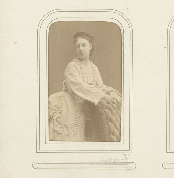 Idanus Hendrikus Slaterus created this small portrait photograph of a seated woman. The sepia tones and the tight composition immediately draw us into the subject’s reserved and thoughtful presence. The woman is positioned almost squarely in the frame, her modest attire suggesting a middle-class background. Note the interplay of light and shadow across her face and dress, achieved through subtle tonal variations that animate her features. Her hands are clasped, drawing our attention to the center of the composition. The background is nondescript, which serves to isolate the woman and emphasize her inner state. In this historical context, portraits like this served not only as personal mementos but also as signifiers of social standing. Slaterus’s careful attention to detail and the woman’s composed demeanor suggests a desire to convey respectability and dignity. The photograph thus functions as a coded representation of identity, revealing as much through its formal elements as it does through its subject. The overall effect is a study in understated elegance and quiet self-possession.
