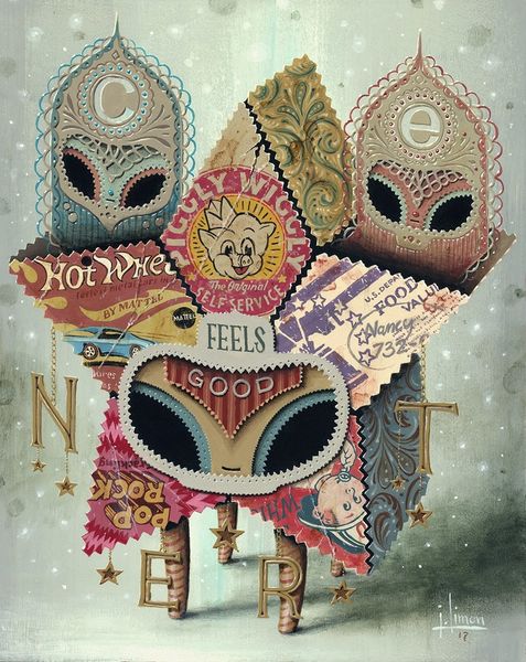 Curator: Oh my! Looking at Jason Limon’s "Royal Paper" from 2016… it’s like stepping into a whimsical dream. So cute, yet so profoundly weird. It makes my head feel all fuzzy with possibility! Editor: The sensation you describe emerges from a carefully calibrated composition, deploying mixed media to create this character, blending pop-surrealism and aspects of realism. I suggest viewers to begin to analyze the collage elements arranged to form the central shape. Curator: You are so right! Each element looks like a postage stamp. I can definitely recognize numbers, letters, miniature portraits… all crowned by that magnificent kingly headgear. The collage is a journey. But wait, those are legs beneath! It changes the entire picture, you know. Suddenly, it’s less regal, more… grounded, almost goofy. Editor: I see your point. And the legs bring me to discuss how he created these contrasting layers—this juxtaposition of the exalted crown with somewhat trivial motifs undermines conventional hierarchies. This allows for discussion around power structures. Curator: Exactly! It makes me ponder what it means to be royal. It’s not just about status or appearing lofty, but being made of all kinds of bits and pieces. Little things that maybe, ultimately, compose what we perceive as ‘royalty’ at all. There's even a mask-like embellishment adorning the ‘face’ of this stamp-being, but I'm really unsure about its significance. Editor: It might function as a motif for obscured identities. The assemblage of postage stamp facets generates a complex texture, encouraging closer scrutiny to interpret these obscured figures and what significance we assign to each character to the whole, including those legs we didn’t miss. Curator: Beautifully said! To sum it all up, "Royal Paper" is like that enigmatic friend—inviting laughter, speculation, and contemplation simultaneously! I really wonder about its process... Editor: I can say I feel inspired to create a tableau of meanings based solely on stamps from my old letters. "Royal Paper" offers insight into a reimagining of ourselves, and art objects through structural reinterpretations and imaginative visual composition.