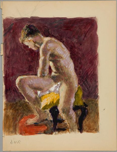 Editor: This is Elmer Bischoff's "Woman Putting on Stocking," created in 1966. It's striking how raw the application of acrylic is; you can really see the strokes and almost feel the texture of the paint. What stands out to you in terms of its materiality or the process of making it? Curator: I'm immediately drawn to how Bischoff foregrounds the act of painting itself. Notice how the visible underpainting peeks through, particularly in the background. The "abstract expressionism" tag hits home, here. How do you think Bischoff is intentionally playing with the flatness of the canvas against the implied three-dimensionality of the figure? Editor: That's a good point. The flatness, especially in the blocky areas of color around the figure, keeps reminding you it's paint. Is he challenging traditional painting by exposing its construction? Curator: Precisely. Consider also the choice of subject matter. A woman putting on a stocking. How does elevating such a mundane, private act into high art – an oil painting in a gallery – shift our understanding of labor and the female body? Editor: It’s almost defiant, turning everyday life into something worthy of artistic attention and consideration of display and labor... very relevant for feminist thought! Curator: Exactly. Bischoff makes visible the usually invisible work of both artistic production and the private lives of women, which society consumes as representations. Editor: This has shifted my thinking a lot! Seeing how the visible brushwork and the choice of subject connect to broader ideas about labor really opened my eyes. Curator: Agreed! Recognizing how materials and production shape our understanding of art, even seemingly simple images, is key.