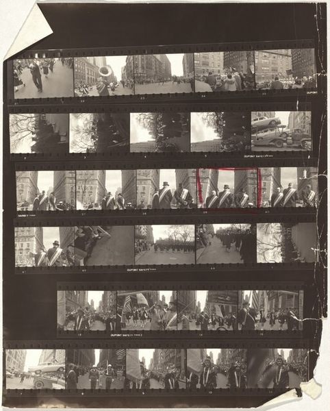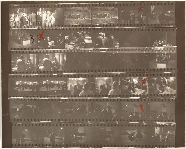 Editor: Here we have Robert Frank's "Museum of Modern Art 7," a gelatin silver print from 1955. It looks like strips of film, maybe contact sheets, showing scenes inside what I presume is the MoMA. There’s a rawness to it that feels almost voyeuristic. What stands out to you in this image? Curator: This piece gives us insight into the art world's mid-century dynamics. We are essentially seeing outtakes – rejected images marked with red crosses – presented as art. Consider the institutional critique at play. Frank seems to be questioning not only what is deemed worthy of display but the very social fabric of the art world itself. Notice the subjects: are they appreciating the art or primarily engaged in social rituals? Editor: That's a compelling point. The red "X" marks really do change how I perceive this; it seems intentional to show what’s discarded. Is this his way of leveling a critique? Curator: Precisely! This deliberate inclusion implicates the viewer. We are looking at what the institution rejects. Frank challenges the established hierarchy of taste. Think about the democratizing potential of photography as a medium, compared to painting or sculpture at the time. He is making art accessible, almost commonplace. Do you feel he succeeds in doing this? Editor: I do. Presenting the image this way invites viewers like me into a conversation about those decisions. What is worthy? Who decides? I suppose in my mind these are relevant, important questions still! Curator: Exactly. Frank used his photography to highlight those conversations. Understanding Frank’s cultural critique enriches our understanding and brings it to a wider audience. Editor: I'll never look at a contact sheet the same way again! It goes to show that even in art, the process of selection and exclusion shapes how we see the world.