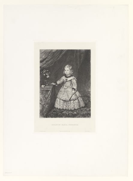 Johannes Christiaan d' Arnaud Gerkens created this portrait of Prince Balthasar Charles of Spain using an etching technique on paper. At first glance, the portrait has an aura of noble austerity, heightened by the use of monochromatic tones. Gerkens masterfully uses chiaroscuro to model the figure. The young prince emerges from a subtly lit backdrop, defined by sharp lines and shadowed areas that give depth to his figure. The use of line is meticulous, carefully delineating the contours of the prince's garments and facial features. The composition, while classical in its portrait format, subtly plays with contrasts. Gerkens, through his etching, invites a deeper reading, subtly questioning the fixed, hierarchical meanings of traditional portraiture. It serves not only as a historical record but also as a semiotic field where power, representation, and artistic technique intersect.