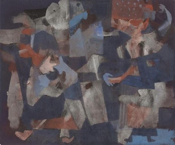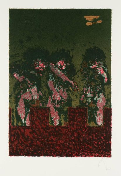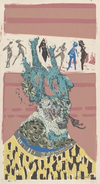 Editor: So this is Nancy Spero's "The Red Cape/Dancer" from 1992, created using acrylic paint, colored pencil, and printmaking techniques. I'm really struck by the juxtaposition of the dancer's seeming freedom against these figures in the background, and how the figures in the background almost feel like they're looming. What's your read on it? Curator: I see it as Spero engaging with power dynamics. The dancer, seemingly joyful and free, is positioned against a backdrop of anonymous figures, which calls into question, 'Whose gaze are we seeing this dancer through?' Spero's work frequently addresses themes of violence, marginalization, and female identity within oppressive structures. Do you think the red cape is a symbol? Editor: Perhaps a symbol of empowerment? Or even vulnerability, given the context you're describing? I hadn't really thought about the figures behind as an explicit power dynamic until now. Curator: It is a great reading! Spero often used the female figure, and this 'dancer', to reclaim narratives and agency. I invite you to look into the context of performance art and feminist performance of the period. What does it tell you when someone in this situation, such as in front of the power structure, shows a vulnerability through, maybe, her nakedness? Editor: Wow. I see it very differently now. It highlights how performative power and even pleasure can be, especially under surveillance. It's really unnerving, but also powerful. Curator: Exactly. And that's what Spero does so brilliantly – she holds the viewer in that space of discomfort, forcing us to confront those complex issues of power and representation. She does make one wonder who is in control of our narrative, doesn't she? Editor: Definitely. I’ll be sitting with this one for a while. Thank you.