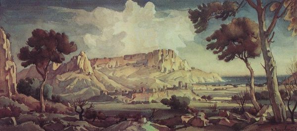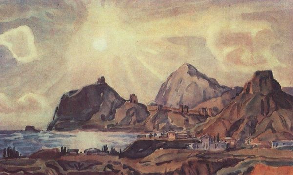 Konstantin Bogaevsky made this painting, After the Rain, at some unknown time with watercolor, and maybe gouache, on paper. It looks like he mixed ochre with a cool grey, which gives it an almost melancholic feel. It's all about the wetness of the washes. I find myself drawn to the way he built up those mountains in layers. See how the paint bleeds ever so slightly. It's like he's letting the landscape emerge from the mist. And those clouds! They're so soft and billowy, like you could just reach out and touch them. I think he really got the mood of a landscape after a storm, you know, that sense of calm and renewal. Bogaevsky reminds me a bit of Caspar David Friedrich, that whole Romantic vibe. But Bogaevsky has his own thing, a kind of quiet intensity. Like he's whispering secrets about the landscape, instead of shouting them. It's a really beautiful piece, and it shows how much can be done with just a few colours and some water.