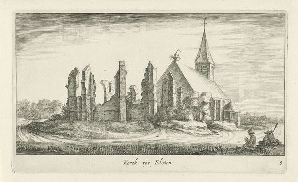 This is Geertruyt Roghman's etching of Kirken in Sloten, made sometime in the mid-17th century. Roghman, a Dutch Golden Age engraver, came from a family of artists, but unlike her brothers, she never achieved widespread recognition. In this print, Roghman depicts both the ruins of an old church and a newer one. The contrast between the decaying structure and the functioning church raises questions about the changing religious landscape in the Netherlands, and the shifting cultural values during this period of rebuilding and reformation. Two figures are seated in the foreground, but instead of looking towards the church, their gaze is directed elsewhere, perhaps symbolizing the societal changes. Through her detailed work, Roghman quietly captures a sense of transition, inviting us to reflect on themes of decay, renewal, and the silent shifts in human focus that accompany them.