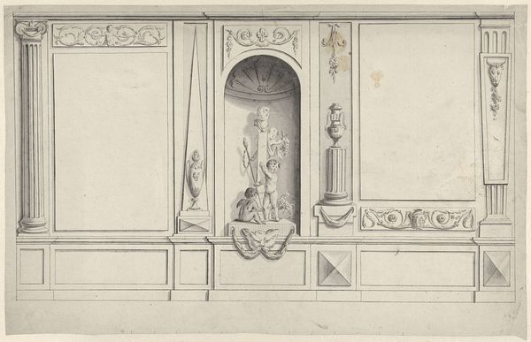 This mural study of the nave of Trinity Church in Boston was made in 1876 by John La Farge, using graphite and gray wash on paper. This work gives insight into the construction of the church and the design considerations of the time. La Farge's quick strokes capture the ornate architectural details, from the arches to the column capitals, and the mural in progress. The medium of graphite and wash allows us to see the development of the artist’s vision, with lines sketched and then filled with tonal depth. The mural, featuring what appear to be seated figures, suggests a narrative or symbolic component integral to the church's design. La Farge was tasked with integrating artwork into the architectural structure. The paper it is drawn on also becomes an integral part of the piece, embodying the first stages of the design process. Examining the work through the lens of materiality and making allows us to appreciate the skilled labor and intentional design that shaped Trinity Church, Boston.
