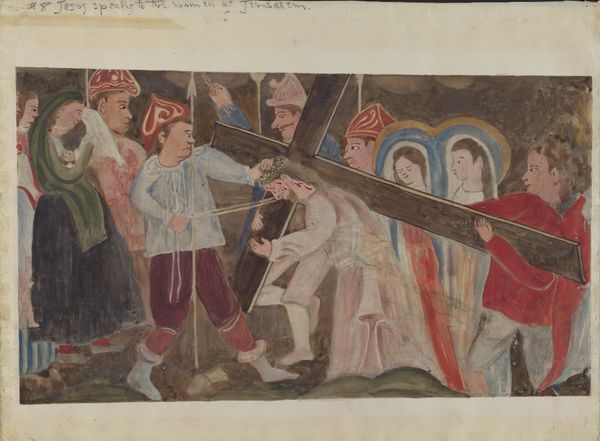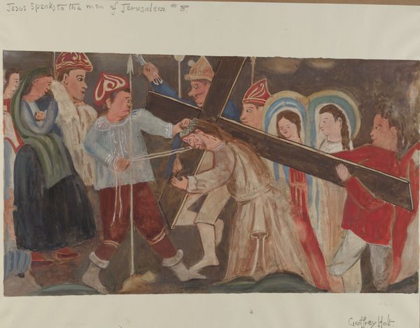 Geoffrey Holt created "Station of the Cross No. 10: "Jesus is Stripped of His Garments,"" using watercolour. The work is striking for its spatial arrangement, which seems to collapse foreground and background. This flattening effect creates a sense of immediacy, pulling the viewer into the scene. Note the composition, bisected by the figure of Christ, whose body, daubed with red, is a focal point amidst a crowd rendered in flat, almost cartoonish forms. Holt’s rendering nods to medieval modes of representation, yet it avoids any sense of historical pastiche. The faces, with their simplified features, resist psychological depth. They function more as signs within a symbolic order. The artist uses colour to underscore this, employing bold contrasts that disrupt any illusion of naturalism. Ultimately, Holt uses the formal elements of the painting to underscore a profound sense of alienation. The viewer is left to question the systems—social, religious, or aesthetic—that produce and perpetuate such scenes.
