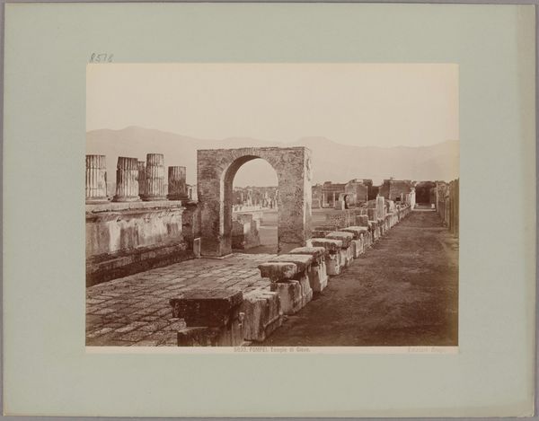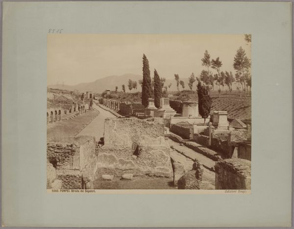 Curator: This is Giacomo Brogi's photograph, "Pompeii, Sepulchre Road, No. 5064," an albumen print dating from about 1870 to 1880. It depicts a streetscape in the ancient Roman city. Editor: It has such a melancholic air. The ruins are beautifully captured but there’s a distinct sense of loss. And the roughness of the road, the heavy stonework; you feel the weight of history. Curator: Brogi and other photographers were crucial in documenting archaeological sites for both scholarly purposes and for popular consumption. This image contributed to the romanticized vision of the classical world that was then in vogue, influencing art and design. Editor: The albumen print process itself adds to the historical feel. Look closely at the tonality and how it interacts with the stone; the technique certainly highlighted the material decay and age of the scene. The very method accentuates time's effects. Curator: Absolutely. Photography served as a vital tool in constructing and disseminating ideas about the past. These images shaped public understanding of ancient cultures and helped legitimize archaeological endeavors. Editor: But think of the labor! From quarrying the stone, shaping it, the sheer amount of time it must have taken to construct these buildings, roads and tombs—all exposed through the patient lens and darkroom alchemy. And, what stories these stones could tell! Curator: These photographs often played a significant role in shaping national identity and cultural heritage. Think of how images of Rome, Athens, and Egypt circulated, solidifying a European connection to the past, as well as colonial agendas. Editor: A reminder, though, that while we contemplate the 'grandeur' of ruins, the photographic process used to document this involves exploitative extraction practices of its own, in sourcing silver or other crucial materials... Food for thought. Curator: Indeed. The image is not just a static record, but a reflection of contemporary ideologies and power dynamics. It’s held in our collection in Städel Museum now, still influencing understanding today. Editor: Precisely; hopefully our little discussion enables a fuller consideration of just how much a single landscape view really offers in its textured and processed surface. Thank you!