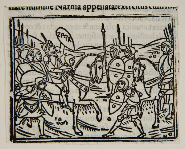 Curator: What strikes me immediately about this anonymous print, "Book III.60. Romans battle the Aequans and Volscians," is the sheer density of the scene. It's a chaotic dance of black lines, isn't it? Editor: Absolutely! It's a visual explosion. Knowing this piece resides within the Harvard Art Museums helps frame its purpose; these images were often used to illustrate historical texts and disseminate knowledge. Curator: Yes, and it's fascinating how the artist captures movement and the brutality of battle with such limited means, just stark contrast. I almost feel like I can hear the clash of swords! Editor: Indeed. Consider how these prints democratized history. Suddenly, tales of Roman conquest were available beyond the elite, shaping public perceptions of power and civilization. Curator: To me, the beauty lies in the artist's ability to convey such a visceral scene. This artwork reminds us about the importance of illustrations in bringing history to life! Editor: I agree, and it underscores the power of imagery in shaping our understanding of the past.