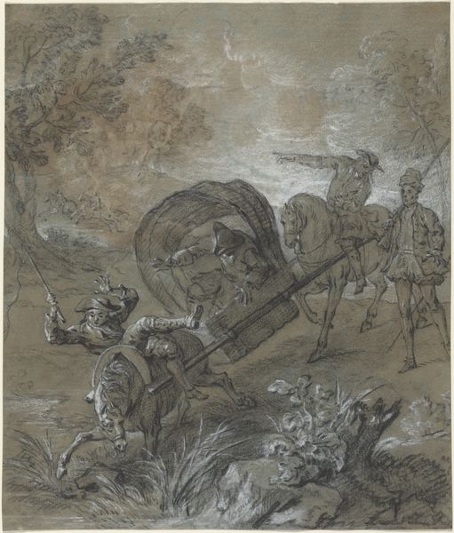 Jean-Baptiste Oudry created this drawing, titled 'Ragotin lie par les parents du fou', using black and white chalk on gray paper. Dating back to the 18th century, this artwork provides a glimpse into historical attitudes towards disability and social status. The image depicts a scene of humiliation and constraint, reflecting prevailing beliefs about controlling those deemed 'mad' or 'foolish' and those lower in social ranking. The body is vulnerable. Oudry's choice of medium, chalk on gray paper, softens what could have been a more stark rendering of violence. The figures blend into the landscape, suggesting how these practices were normalized. How does Oudry’s piece negotiate these ideas of class, power, and the concept of madness that was prevalent during his time?