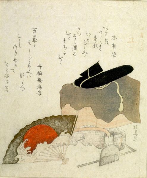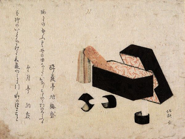 Editor: So, here we have Kubo Shunman’s "Black Tea Caddy," part of the "Five Colors of Tea Utensils" series. The prints don’t have a precise date, but Shunman lived in the late 18th and early 19th century. I am intrigued by the contrast between the darkness of the caddy and the faded, dreamy colors surrounding it. What do you make of its muted palette? Curator: You know, it's interesting how Shunman uses that contrast to draw our eye. The poems also add another layer. They are collaborations, like a tea ceremony itself, a shared experience steeped in ritual and conversation. What do you think the artist trying to communicate about the tea ceremony? Editor: Maybe that it is more than just the tea itself, but the social and artistic connections it fosters? Thank you; that’s really given me a fresh perspective! Curator: Absolutely! It all comes back to the idea of finding beauty and connection in the everyday.