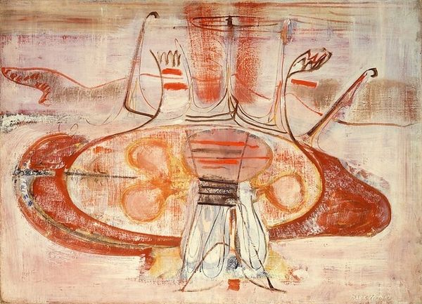 Editor: Here we have Mark Rothko’s “Sacrificial Moment,” painted in 1945 using oil paint and employing the impasto technique. The initial impact is rather unsettling, I think, with those suggestive biomorphic forms and muted colors. How do you interpret this work, especially given its title? Curator: The title certainly evokes the solemn and potentially violent act of sacrifice, but consider Rothko’s socio-political context. This work emerged just as World War II was ending and the Holocaust's horrors were coming to light. Rothko, a Jewish immigrant himself, would have been deeply affected. Could this ‘sacrificial moment’ be a commentary on the immense loss and destruction of human life, perhaps even a response to the scapegoating of entire communities? Editor: That's a really powerful point. I hadn't fully considered the weight of that historical context. Do you see the abstracted forms relating to specific figures or symbols within that narrative of sacrifice and loss? Curator: Look at the lines, the blurred forms, and how the composition almost dissolves. Do they suggest a kind of violence, the loss of individual identity within a collective trauma? Perhaps the abstracted forms are deliberately ambiguous, so they resonate universally, allowing for individual and collective grief to find expression. Editor: So it is a visual metaphor for shared human suffering at its deepest levels? A powerful and important consideration for any work of art. Curator: Precisely. It's about acknowledging that art doesn't exist in a vacuum. It's a reflection of and a response to our shared history and contemporary struggles. This painting invites us to confront uncomfortable truths and grapple with the complexities of human existence. Editor: Thank you, this definitely shifted how I view it; what I saw as simply an unsettling painting seems now to represent something profound. Curator: And that's the beauty of engaging with art critically—unveiling those deeper layers and allowing for more nuanced understanding.