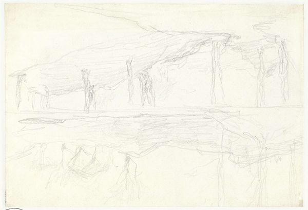 Editor: This is “Figuren op een boslaan,” or “Figures on a Forest Lane,” a pencil drawing created around 1843 or 1844 by Johannes Tavenraat, and it's currently held at the Rijksmuseum. The drawing feels very raw and almost unfinished. What do you make of this piece? Curator: The initial impact of this drawing relies heavily on the skeletal structure that Tavenraat creates through line. Note how the repeated verticals of the tree trunks establish a clear, albeit sparse, division of space. The sketchiness contributes to the open form. Do you see how this adds dynamism? Editor: I do. The lines aren’t closed off, which makes it feel like you're glimpsing something in motion. But what about the composition itself? Curator: Consider the upper portion: a web of lines indicating branches. These forms aren't fully realized, drawing our attention to the process of their creation, of the artist attempting to capture light filtering through foliage. Editor: So the incompleteness is deliberate, and it is the subject itself? Curator: The essence lies in the raw application of materials—pencil on paper— and the structural integrity conveyed through basic compositional choices. The open form generates depth. Are there other visual cues you note? Editor: Well, the figures hinted at in the undergrowth… they almost dissolve into the landscape. It shows that the process of drawing becomes a form of discovery in itself. Thank you, I’ve gained a fresh viewpoint. Curator: Indeed. The skeletal structure holds considerable visual information that informs and transforms the scene into something truly special.
