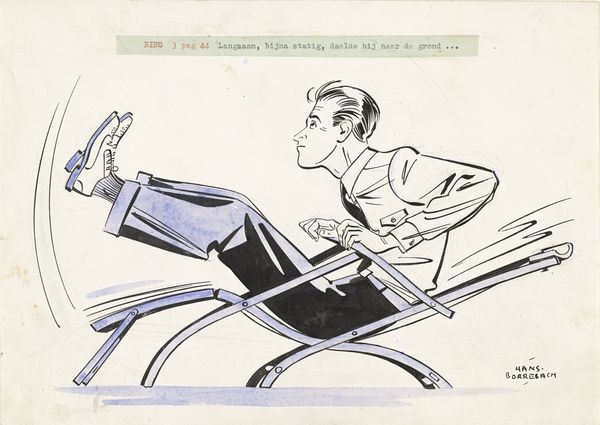Editor: Here we have Hans Borrebach's "Piet Bing bekijkt een boek in de boekhandel van Bom," a pen and ink drawing from before 1954. The scene feels like a snapshot of everyday life, but there's something subtly theatrical about it, almost like a still from a mid-century film. What jumps out at you when you look at it? Curator: I see a fascinating interplay between individual action and social performance. Consider the title: we’re not just seeing someone read, but seeing them do it in a bookstore, specifically Bom's. The setting infuses the act of reading with public significance, suggesting that even seemingly private moments are shaped by cultural context. Who was Piet Bing and what did Bom's bookstore represent in the cultural landscape of the time? Editor: I have no idea! Does the drawing style give us any clues? Curator: Absolutely. The use of stark lines and limited color palette is reminiscent of illustration and comics which saw huge popularity in the 50's. Borrebach is likely engaging in social commentary, positioning book culture within reach for the everyman by rendering it using popular print making styles. This challenges traditional fine art boundaries while speaking directly to a wider audience. What social themes emerge from this visual approach? Editor: Well, the 'everyman' approach feels populist, right? Almost encouraging broader engagement with literature? Curator: Precisely. It emphasizes the accessibility and potential democratization of knowledge. This kind of imagery, appearing in print, undoubtedly helped shape public perception and participation in book culture at the time. Editor: I never considered how much context could be embedded even in a seemingly simple illustration! Thank you for pointing all that out. Curator: My pleasure. Art history is so much more exciting when you can connect art and history and their reciprocal influences.
