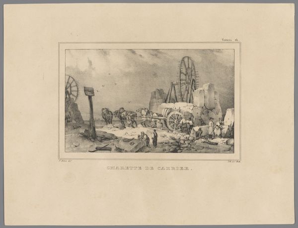 Nicolas Toussaint Charlet created this lithograph, "Mopperpot," around 1840. The monochromatic tones and textured application of ink create a scene dominated by the stark contrast between destruction and stoic endurance. The composition is divided into three distinct sections. On the left, a pile of rubble stands precariously, while a lone soldier occupies the center. To the right, the landscape opens, creating a sense of depth. Charlet uses line and texture to convey the harsh realities of war. The jagged edges of the ruins contrast with the soldier's stiff posture, encapsulating a feeling of resilience amidst devastation. The print can be seen as a commentary on the romanticized ideals of war. By focusing on the physical and emotional toll on the individual soldier, Charlet destabilizes heroic narratives. The soldier, though upright, seems weary, highlighting the cost of conflict. The formal choices reflect a broader cultural dialogue about war’s impact.