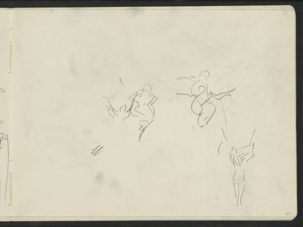 Curator: Isaac Israels’ "Twee staande vrouwen", made between 1875 and 1934, is a pencil drawing currently held here at the Rijksmuseum. Editor: Well, it’s certainly a sketch. It has a real raw energy about it. It almost feels incomplete but holds your attention. Curator: Precisely. Observe the economy of line. Israels captures the essence of the figures with minimal strokes. The spatial relationship between the women is suggested more than defined. Editor: I'm intrigued by that lack of definition, and I am especially interested in understanding its historical context. What can we understand of women and labor during Israels' time? What stories do these bodies silently hold about gender roles? Curator: It's difficult to place that kind of narrative within this artwork due to the figures dissolving. Rather, it becomes an interrogation of the fundamentals of figuration, of form and suggestion. Notice, too, the expressive marks on the side – a sort of gestural annotation. Editor: Those are definitely intriguing. Maybe a signature. For me, that act of abbreviation is rife with social commentary. Women, throughout art history, especially laboring class women, have often been seen through quick or minimized artistic representations. It echoes that feeling of invisibility. Curator: But doesn't that also speak to Impressionism, which focuses on fleeting impressions, quick takes of observed reality. Perhaps its more in line with stylistic gestures in his painting rather than some complex dialogue on historical context. Editor: I think it’s important to not see historical narratives and formalist structure as distinct. Can’t these expressive gestures give insights on gender and social structures as much as color or shape? Curator: You make a compelling point. By dissecting and observing that tension, we gain a deeper understanding of the dialogue at play here. Editor: Absolutely. I’ll be spending some time considering these implications a bit further.